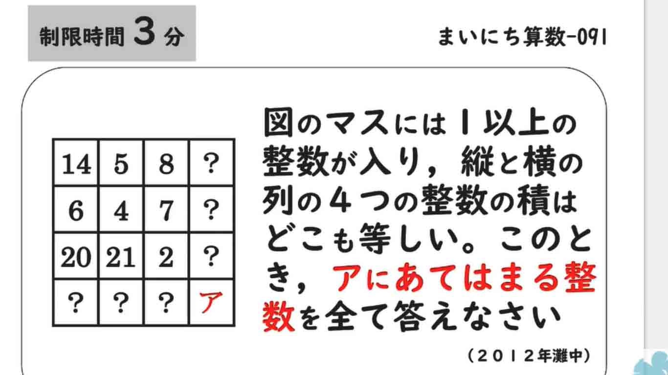 Posted inMath 算数 4x4掛け算魔法陣の解き方 Posted by EduMom 03/09/2020ColorfulTube おすすめ動画 画像をクリックYouTubeへ移動難易度 高 4x4の掛け算魔法陣の動画です。しかも、縦、横、斜めの数字を足すのではなく、掛け算して、すべて同じ数字になる問題です。 3x3の魔法陣は、1種類しか存在しないが、4x4の魔法陣は、880種類が存在します。それで、問題で、当てはまる全ての整数を答えるようになっています。 この問題は、整数の定義と素因数分解について知らないと解けません。 4行・1列のマスの数字は、なぜ3にならないのかよく考えてください。 英語で整数 素因数分解Related Posts:3x3魔法陣は、1種類しか存在しない[ 英文法 ]英文ストーリーで、現在進行形マスター同位角と錯角の算数問題[ 英文法 ]簡単!疑問文の作り方[ 英文法 ] 前置詞、'に、で、から、まで'の英語表現素数計算機プログラミング(英語) EduMom View All PostsPost navigationPrevious Post 3x3魔法陣の解き方Next Post整数と小数
